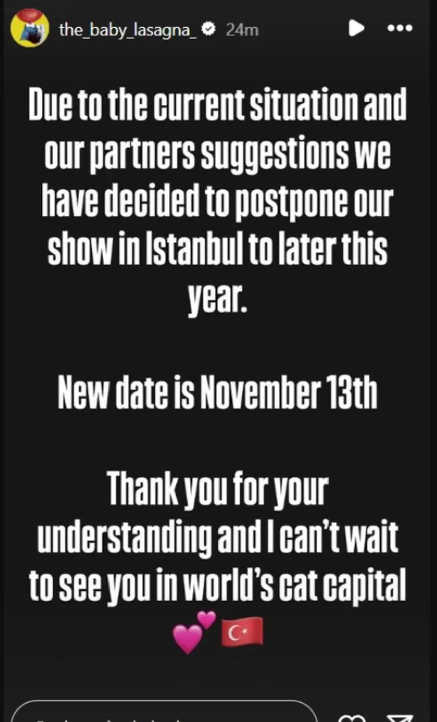 “Zbog trenutne situacije i prijedloga naših partnera odlučili smo odgoditi naš nastup u Istanbulu za kasnije ove godine. Novi datum je 13. studenoga. Hvala vam na razumijevanju i jedva čekam da vas vidim u svjetskoj prijestolnici mačaka”, objavio je na Instagramu.