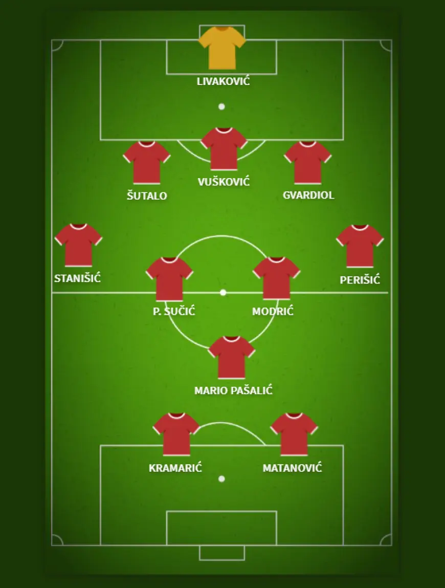 Hrvatska: Livaković - Stanišić, Vušković, Gvardiol - Marco Pašalić, Modrić, Sučić, Perišić - Mario Pašalić, Kramarić - Musa