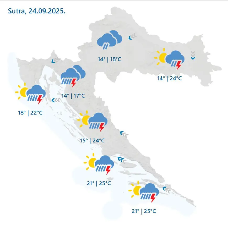 Državni hidrometeorološki zavod (DHMZ) za danas je najavio promjenjivo, na zapadu unutrašnjosti i pretežno oblačno vrijeme, uz kišu s pljuskovima i grmljavinom na sjevernom Jadranu i u Gorskoj Hrvatskoj, koja bi se se prema kraju dana mogla spustiti i na sjever Dalmacije.