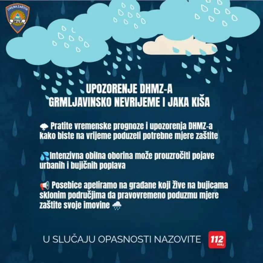 - Pratite vremenske prognoze i upozorenja DHMZ-a kako biste na vrijeme poduzeli potrebne mjere zaštite. Intenzivna obilna oborina može prouzročiti pojave urbanih i bujičnih poplava. Posebice apeliramo na građane koji žive na bujicama sklonim područjima da pravovremeno poduzmu mjere zaštite svoje imovine. U slučaju opasnosti nazovite 112 - poručili su.