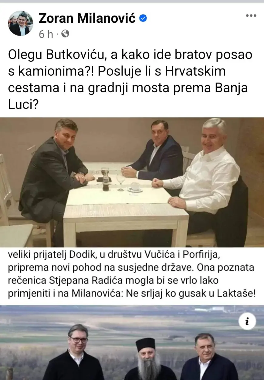 Odovor je to na jutrošnju objavu Olega Butkovića na Facebooku, koji je na svom Facebooku podijelio poveznicu na vijest Jutarnjeg lista naslova ‘Vučić, Dodik i Porfirije objavili srpski osvajački program: ‘Krećemo točno 5. i 6. svibnja!‘, uz poruku Zoranu Milanoviću.