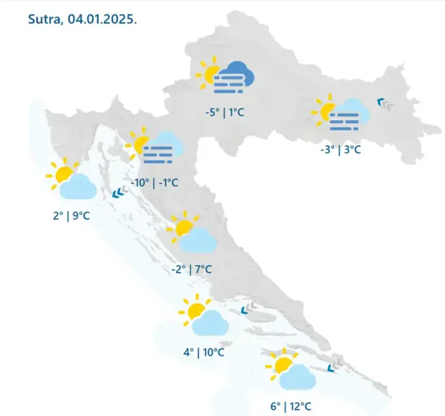 U unutrašnjosti hladno, prijepodne uz čestu maglu ili nisku naoblaku, no lokalno se mogu i dulje zadržati.