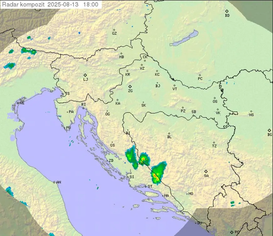 Najjači oblaci razvili su se iznad Cetinske krajine, osobito iznad Sinja. Na mjernoj postaji Sinj do 19 sati palo je 38 litara kiše po metru kvadratnome.