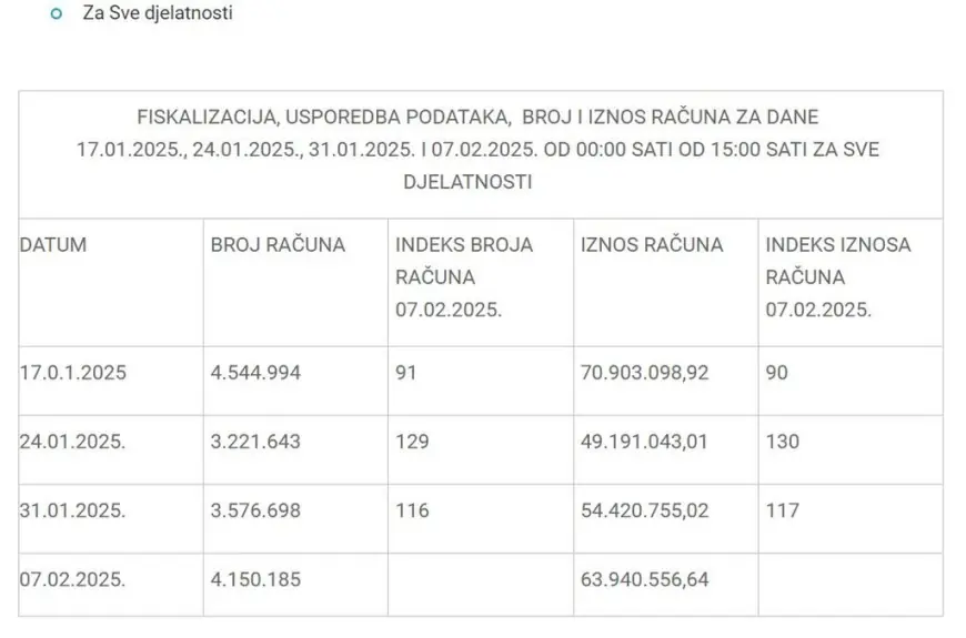Kada su u pitanju Sve djelatnosti, iz podataka je vidljivo da je broj računa u petak 7. veljače od 00:00 do 15:00 sati u odnosu na petak 31. siječnja veći 16 posto, dok je iznos računa također veći za 17 posto. Nadalje, u petak broj računa je veći za 29 posto, dok je iznos računa također veći za 30 posto.