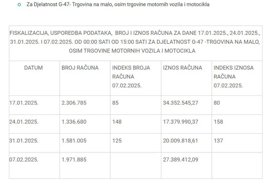 Za Djelatnost G-47- Trgovina na malo, osim trgovine motornih vozila i motocikla, iz podataka je vidljivo da je broj računa u petak 7. veljače od 00:00 do 15:00 sati u odnosu na petak 31. siječnja za isto vrijeme veći 25 posto, dok je iznos računa također veći za 37 poto. U odnosu na petak 24. siječnja, broj računa je veći za 48 posto dok je iznos računa također veći za 58 posto.