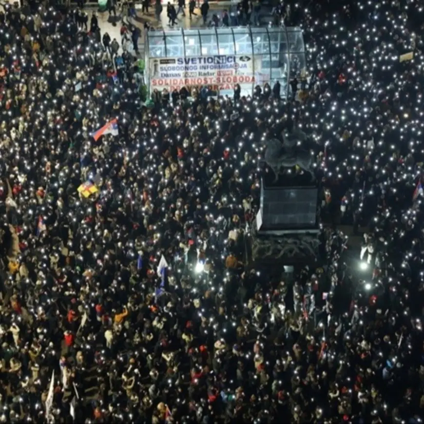 Studenti i građani stajali su u tišini, s uključenim bljeskalicama na mobitelima, do sedam minuta poslije ponoći, na petom masovnom skupu koji je u Srbiji održan u valu višemjesečnih prosvjeda potaknutih novosadskom tragedijom.